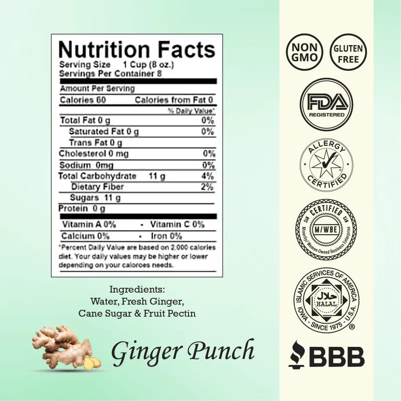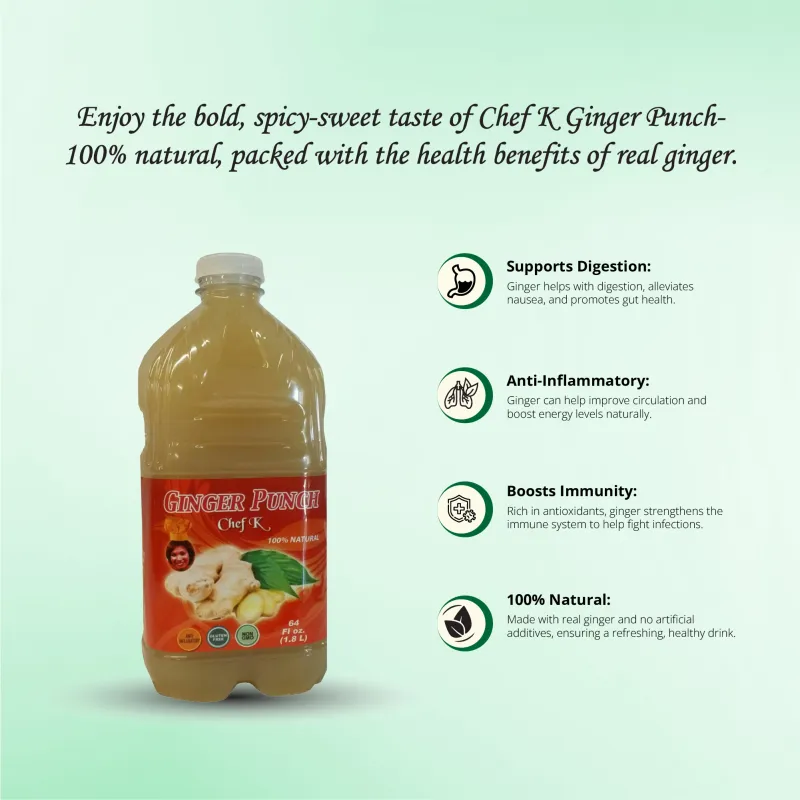 Chef K Ginger Punch in the 64 oz family-size bottle delivers the bold, spicy flavor of natural ginger. Known for its digestive health benefits, this classic ginger drink is perfect for family meals or gatherings. Whether served chilled over ice or used as a mixer in cocktails, it’s a versatile and refreshing beverage. Made with all-natural ingredients and free from artificial sweeteners or preservatives, it’s the ideal choice for those looking to enjoy the classic taste of ginger in a healthy and delicious way.